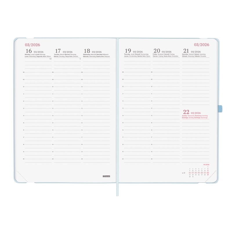 Agenda encuadernada de tapa blanda de tacto suave y agradable. Diseños en tendencia y a la moda con detalles estampados metalizados. Ideal para uso personal y/o profesional. Con cinta punto y bolsillo interior con fuelle de papel tejido muy resistente al uso. También goma elástica y anilla portabolígrafo para llevar siempre contigo un elemento de escritura. Apertura perfecta para poder escribir cómodamente y esquinas microperforadas para localizar rápidamente el día/semana en curso. El diseño interior es limpio y fácil, con espacio suficiente para organizar tus proyectos, tareas y compromisos. La agenda incluye información de interés en la anualidad y otros contenidos extra orientados a la organización personal. Formato DIN A5. Duración: Enero 2026 – Diciembre 2026 (12 meses). Interior: Semana Vista Vertical. Visión de la semana completa en vertical. Con medias horas. Con información en la anualidad de los festivos de los siguientes países: Argentina, Australia, Bélgica, Brasil, Suiza, Chile, Alemania, España, Francia, Reino Unido, Irlanda, Italia, Luxemburgo, Mónaco, México, Países Bajos, Polonia, Portugal, Rumanía, Rusia, Suecia, Ucrania y Estados Unidos. La anualidad de la agenda incluye la información relativa a: festivos internacionales e inicios de los años nuevos chino, musulmán, ortodoxo y hebreo. La agenda dispone también de otros contenidos extra: datos personales, calendarios, códigos de los países, horarios, planificación anual en columnas, planificación mensual cuadriculada con las fases lunares, hoja para notas y contactos. Artículo multilingüe: inglés, francés, italiano, alemán, español, neerlandés, portugués y catalán. Formato: FA5 – 148×210 mm. Poliuretano flexible y papel. 80 g/m². Papel FSC®.