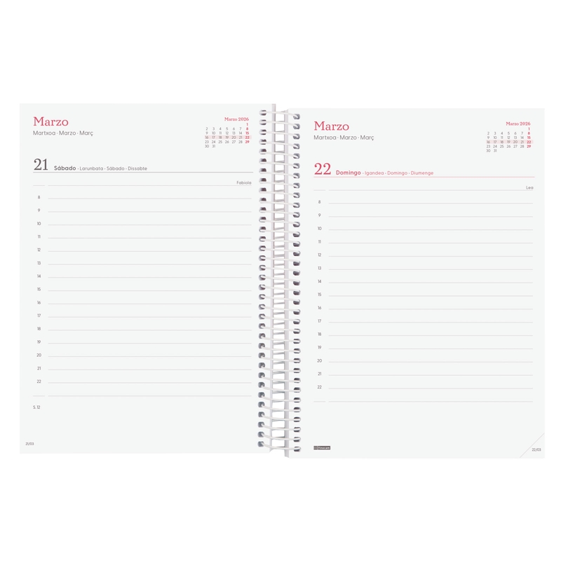 Agenda de espiral con tapas ligeras de polipropileno. Diseño en tendencia y a la moda. Ideal para uso personal y/o profesional. Con goma elástica. Con esquinas microperforadas para localizar rápidamente el día/semana en curso. El diseño interior es limpio y fácil, con espacio suficiente para organizar tus proyectos, tareas y compromisos. Agenda con información de interés en la anualidad y otros contenidos extra orientados a la organización personal. Formato similar a DIN A5; con las ventajas de una agenda portable y una de sobremesa. Duración: Enero 2026 – Diciembre 2026 (12 meses). Interior: 1 Día Página. Amplio espacio de escritura para cada día. Con horas. Sábados y domingos en página completa. Con información de los festivos de España. La anualidad de la agenda incluye la información relativa a: onomástica, festivos nacionales, cambios de estación e inicios de los años nuevos chino, musulmán, ortodoxo y hebreo. La agenda dispone también de otros contenidos extra: datos personales, calendarios, horarios, objetivos del año, plan anual, fechas importantes, otras fechas, hojas para checklist, hojas para notas, hoja para ocio y hojas para teléfonos, direcciones y e-mails. Artículo en español con anualidad multilingüe: español, euskera, gallego y catalán. Formato: E10 – 155×212 mm. Tapas de polipropileno, espiral simple metálica y papel. 70 g/m². Papel FSC®.