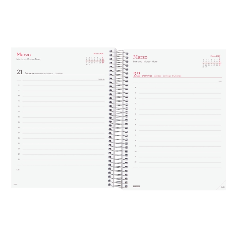 Agenda de espiral con tapas ligeras de polipropileno. Diseño en tendencia y a la moda. Ideal para uso personal y/o profesional. Con goma elástica. Con esquinas microperforadas para localizar rápidamente el día/semana en curso. El diseño interior es limpio y fácil, con espacio suficiente para organizar tus proyectos, tareas y compromisos. Agenda con información de interés en la anualidad y otros contenidos extra orientados a la organización personal. Formato similar a DIN A5; con las ventajas de una agenda portable y una de sobremesa. Duración: Enero 2026 – Diciembre 2026 (12 meses). Interior: 1 Día Página. Amplio espacio de escritura para cada día. Con horas. Sábados y domingos en página completa. Con información de los festivos de España. La anualidad de la agenda incluye la información relativa a: onomástica, festivos nacionales, cambios de estación e inicios de los años nuevos chino, musulmán, ortodoxo y hebreo. La agenda dispone también de otros contenidos extra: datos personales, calendarios, horarios, objetivos del año, plan anual, fechas importantes, otras fechas, hojas para checklist, hojas para notas, hoja para ocio y hojas para teléfonos, direcciones y e-mails. Artículo en español con anualidad multilingüe: español, euskera, gallego y catalán. Formato: E10 – 155×212 mm. Tapas de polipropileno, espiral simple metálica y papel. 70 g/m². Papel FSC®.