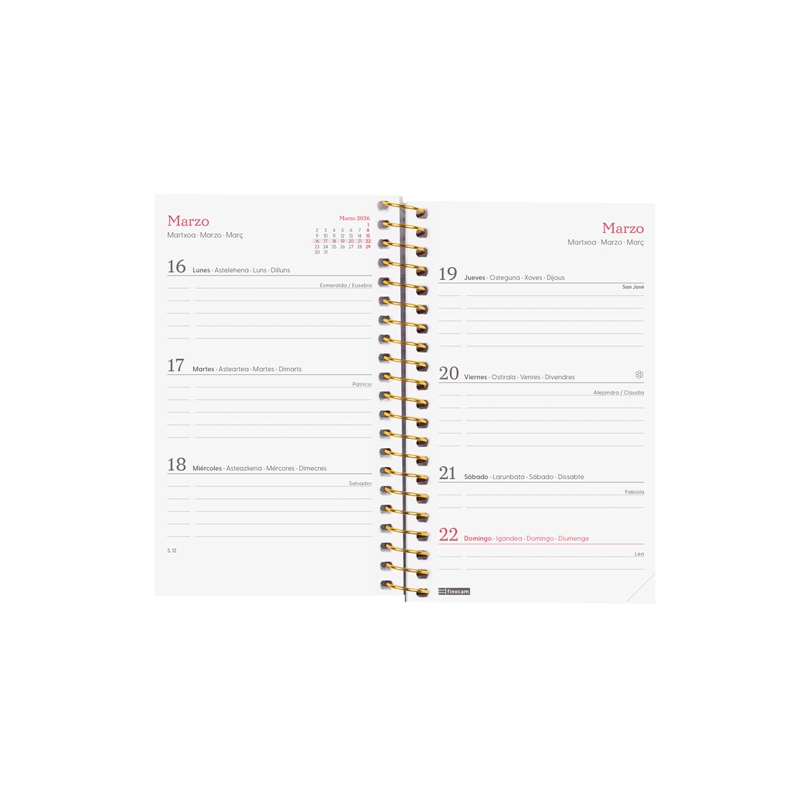 Agenda de espiral con tapas ligeras de polipropileno. Diseño en tendencia y a la moda. Ideal para uso personal y/o profesional. Con goma elástica. Con esquinas microperforadas para localizar rápidamente el día/semana en curso. El diseño interior es limpio y fácil, con espacio suficiente para organizar tus proyectos, tareas y compromisos. Agenda con información de interés en la anualidad y otros contenidos extra orientados a la organización personal. Formato mini, ligero y liviano. Ideal para llevar siempre contigo. Duración: Enero 2026 – Diciembre 2026 (12 meses). Interior: Semana Vista Horizontal. Visión de la semana completa en horizontal que permite la escritura natural. Con espacio para concretar horario. Con información de los festivos de España. La anualidad de la agenda incluye la información relativa a: onomástica, festivos nacionales, cambios de estación e inicios de los años nuevos chino, musulmán, ortodoxo y hebreo. La agenda dispone también de otros contenidos extra: datos personales, calendarios, horarios, objetivos del año, plan anual, fechas importantes, otras fechas, hojas para checklist, hojas para notas, hoja para ocio y hojas para teléfonos, direcciones y e-mails. Artículo en español con anualidad multilingüe: español, euskera, gallego y catalán. Formato: E3 – 79×127 mm. Tapas de polipropileno, espiral simple metálica y papel. 80 g/m². Papel FSC®.