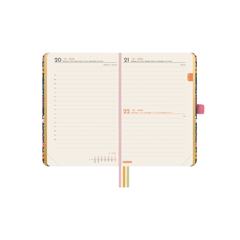 Agenda de tapa dura con diseños en tendencia y a la moda. Perfecta apertura para poder escribir cómodamente. Con cinta punto, goma elástica y anilla portabolígrafo para llevar siempre contigo un elemento de escritura. Bolsillo interior con fuelle de papel tejido muy resistente al uso. Esquinas microperforadas para localizar rápidamente el día/semana en curso. Para facilitar la localización de cada mes, la anualidad incorpora un indicador en el lateral derecho de las páginas. La anualidad contiene información de interés y otros contenidos extra. Formato mini, ligero y liviano. Ideal para llevar siempre contigo. Duración: Enero 2026 – Diciembre 2026 (12 meses). Interior: 1 Día Página. Amplio espacio de escritura para cada día. Con horas. Con información de los festivos de España. La anualidad de la agenda incluye la información relativa a la onomástica y a los festivos nacionales. La agenda dispone también de otros contenidos extra: datos personales, calendarios, horario, planificación anual en columnas, planificación mensual cuadriculada, fechas para destacar, hojas para tareas y anotaciones y hojas para teléfonos, direcciones y e-mails. Artículo en español con anualidad multilingüe: español, inglés, portugués, gallego, catalán y euskera. Formato: M2 – 82×127 mm. Tapas de cartón forrado y estampación. 80 g/m². Papel FSC®.
