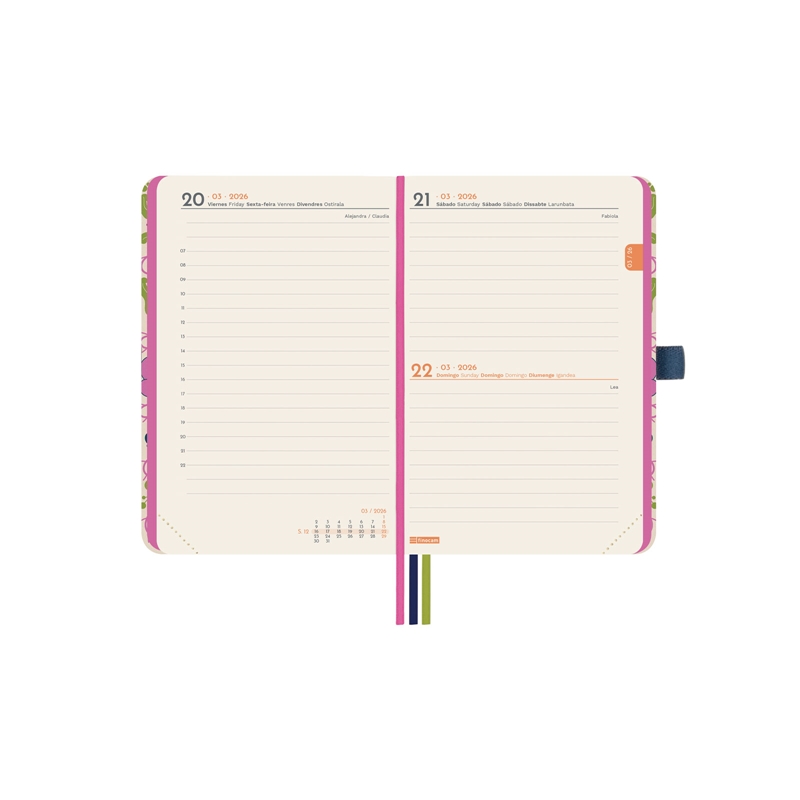Agenda de tapa dura con diseños en tendencia y a la moda. Perfecta apertura para poder escribir cómodamente. Con cinta punto, goma elástica y anilla portabolígrafo para llevar siempre contigo un elemento de escritura. Bolsillo interior con fuelle de papel tejido muy resistente al uso. Esquinas microperforadas para localizar rápidamente el día/semana en curso. Para facilitar la localización de cada mes, la anualidad incorpora un indicador en el lateral derecho de las páginas. La anualidad contiene información de interés y otros contenidos extra. Formato mini, ligero y liviano. Ideal para llevar siempre contigo. Duración: Enero 2026 – Diciembre 2026 (12 meses). Interior: 1 Día Página. Amplio espacio de escritura para cada día. Con horas. Con información de los festivos de España. La anualidad de la agenda incluye la información relativa a la onomástica y a los festivos nacionales. La agenda dispone también de otros contenidos extra: datos personales, calendarios, horario, planificación anual en columnas, planificación mensual cuadriculada, fechas para destacar, hojas para tareas y anotaciones y hojas para teléfonos, direcciones y e-mails. Artículo en español con anualidad multilingüe: español, inglés, portugués, gallego, catalán y euskera. Formato: M2 – 82×127 mm. Tapas de cartón forrado y estampación. 80 g/m². Papel FSC®.