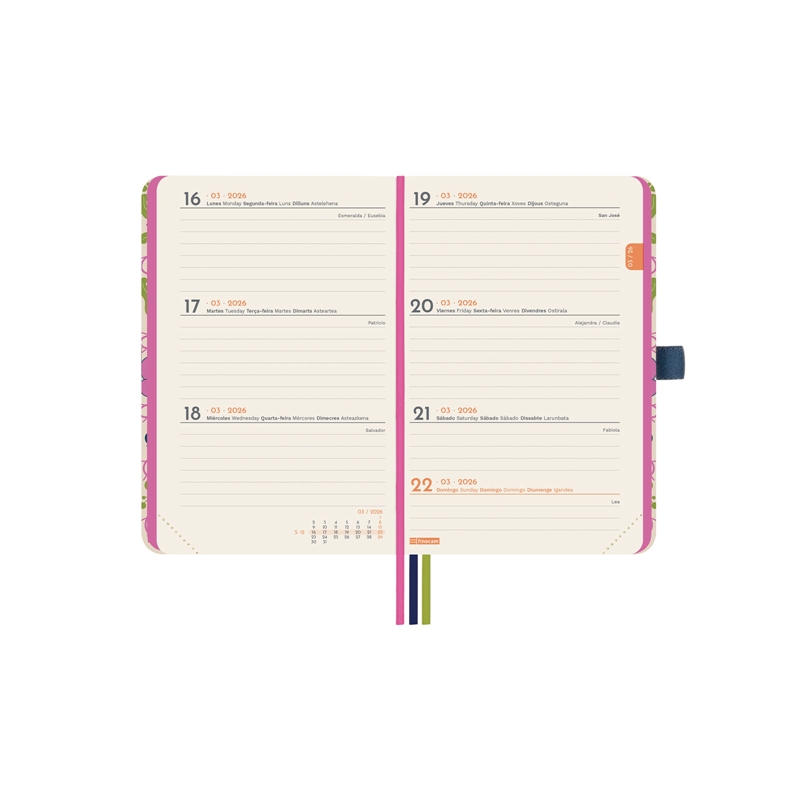 Agenda de tapa dura con diseños en tendencia y a la moda. Perfecta apertura para poder escribir cómodamente. Con cinta punto, goma elástica y anilla portabolígrafo para llevar siempre contigo un elemento de escritura. Bolsillo interior con fuelle de papel tejido muy resistente al uso. Esquinas microperforadas para localizar rápidamente el día/semana en curso. Para facilitar la localización de cada mes, la anualidad incorpora un indicador en el lateral derecho de las páginas. La anualidad contiene información de interés y otros contenidos extra. Formato mini, ligero y liviano. Ideal para llevar siempre contigo. Duración: Enero 2026 – Diciembre 2026 (12 meses). Interior: Semana Vista Horizontal. Visión de la semana completa en horizontal que permite la escritura natural. Con información de los festivos de España. La anualidad de la agenda incluye la información relativa a la onomástica y a los festivos nacionales. La agenda dispone también de otros contenidos extra: datos personales, calendarios, horario, planificación anual en columnas, planificación mensual cuadriculada, fechas para destacar, hojas para tareas y anotaciones y hojas para teléfonos, direcciones y e-mails. Artículo en español con anualidad multilingüe: español, inglés, portugués, gallego, catalán y euskera. Formato: M2 – 82×127 mm. Tapas de cartón forrado y estampación. 80 g/m². Papel FSC®.
