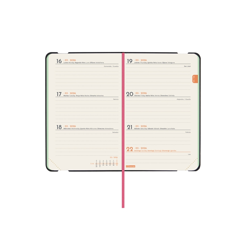 Agenda encuadernada de tapa blanda amb material de tacto suave y agradable. Con diseños en tendencia y a la moda e impresión en el perímetro de las hojas. Perfecta apertura para poder escribir cómodamente. Con goma elástica y cinta punto. Esquinas microperforadas para localizar rápidamente el día/semana en curso. Para facilitar la localización de cada mes, la anualidad incorpora un indicador en la parte superior de las páginas. La anualidad incluye información de interés y otros contenidos extra. Formato mini, ligero y liviano. Ideal para llevar siempre contigo. Duración: Enero 2026 – Diciembre 2026 (12 meses). Interior: Semana Vista Horizontal. Visión de la semana completa en horizontal que permite la escritura natural. Con información de los festivos de España. La anualidad de la agenda incluye la información relativa a la onomástica y a los festivos nacionales. La agenda dispone también de otros contenidos extra: datos personales, calendarios, horario, planificación anual en columnas, planificación mensual cuadriculada, fechas para destacar, hojas para tareas y anotaciones y hojas para teléfonos, direcciones y e-mails. Artículo en español con anualidad multilingüe: español, inglés, portugués, gallego, catalán y euskera. Formato: F2 – 82×127 mm. Poliuretano flexible y papel. 80 g/m². Papel FSC®.