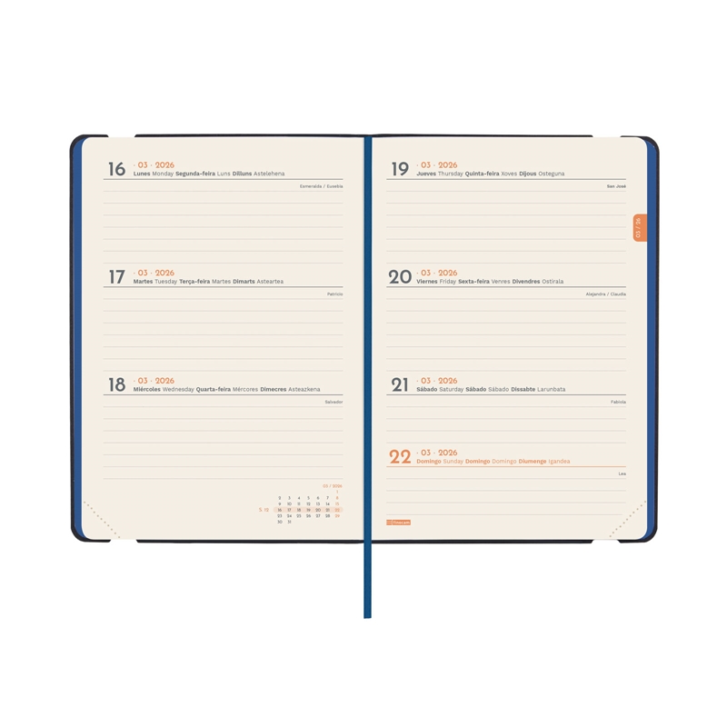 Agenda encuadernada de tapa blanda amb material de tacto suave y agradable. Con diseños en tendencia y a la moda e impresión en el perímetro de las hojas. Perfecta apertura para poder escribir cómodamente. Con goma elástica y cinta punto. Esquinas microperforadas para localizar rápidamente el día/semana en curso. Para facilitar la localización de cada mes, la anualidad incorpora un indicador en la parte superior de las páginas. La anualidad incluye información de interés y otros contenidos extra. Formato pequeño y práctico, fácil de transportar. Ideal para llevar contigo. Duración: Enero 2026 – Diciembre 2026 (12 meses). Interior: Semana Vista Horizontal. Visión de la semana completa en horizontal que permite la escritura natural. Con información de los festivos de España. La anualidad de la agenda incluye la información relativa a la onomástica y a los festivos nacionales. La agenda dispone también de otros contenidos extra: datos personales, calendarios, horario, planificación anual en columnas, planificación mensual cuadriculada, fechas para destacar, hojas para tareas y anotaciones y hojas para teléfonos, direcciones y e-mails. Artículo en español con anualidad multilingüe: español, inglés, portugués, gallego, catalán y euskera. Formato: F4 – 118×168 mm. Poliuretano flexible y papel. 80 g/m². Papel FSC®.