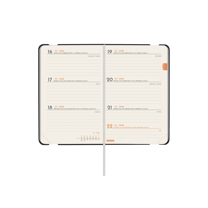 Agenda encuadernada de tapa blanda amb material de tacto suave y agradable. Impresión en el perímetro de las hojas. Perfecta apertura para poder escribir cómodamente. Con goma elástica y cinta punto. Esquinas microperforadas para localizar rápidamente el día/semana en curso. Para facilitar la localización de cada mes, la anualidad incorpora un indicador en la parte superior de las páginas. La anualidad incluye información de interés y otros contenidos extra. Formato mini, ligero y liviano. Ideal para llevar siempre contigo. Duración: Enero 2026 – Diciembre 2026 (12 meses). Interior: Semana Vista Horizontal. Visión de la semana completa en horizontal que permite la escritura natural. Con información de los festivos de España. La anualidad de la agenda incluye la información relativa a la onomástica y a los festivos nacionales. La agenda dispone también de otros contenidos extra: datos personales, calendarios, horario, planificación anual en columnas, planificación mensual cuadriculada, fechas para destacar, hojas para tareas y anotaciones y hojas para teléfonos, direcciones y e-mails. Artículo en español con anualidad multilingüe: español, inglés, portugués, gallego, catalán y euskera. Formato: F2 – 82×127 mm. Poliuretano flexible y papel. 80 g/m². Papel FSC®.