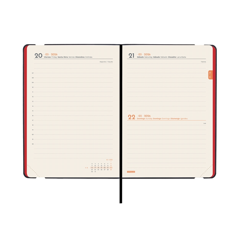 Agenda encuadernada de tapa blanda amb material de tacto suave y agradable. Impresión en el perímetro de las hojas. Perfecta apertura para poder escribir cómodamente. Con goma elástica y cinta punto. Esquinas microperforadas para localizar rápidamente el día/semana en curso. Para facilitar la localización de cada mes, la anualidad incorpora un indicador en la parte superior de las páginas. La anualidad incluye información de interés y otros contenidos extra. Formato pequeño y práctico, fácil de transportar. Ideal para llevar contigo. Duración: Enero 2026 – Diciembre 2026 (12 meses). Interior: 1 Día Página. Amplio espacio de escritura para cada día. Con horas. Con información de los festivos de España. La anualidad de la agenda incluye la información relativa a la onomástica y a los festivos nacionales. La agenda dispone también de otros contenidos extra: datos personales, calendarios, horario, planificación anual en columnas, planificación mensual cuadriculada, fechas para destacar, hojas para tareas y anotaciones y hojas para teléfonos, direcciones y e-mails. Artículo en español con anualidad multilingüe: español, inglés, portugués, gallego, catalán y euskera. Formato: F4 – 118×168 mm. Poliuretano flexible y papel. 80 g/m². Papel FSC®.