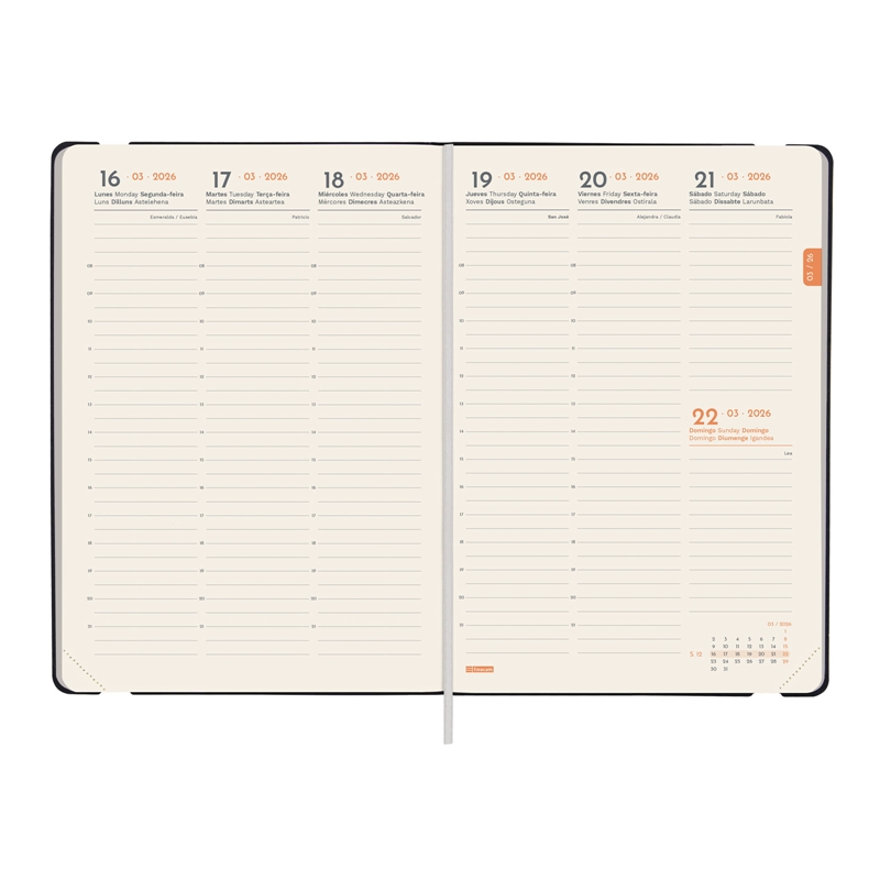 Agenda encuadernada de tapa blanda amb material de tacto suave y agradable. Impresión en el perímetro de las hojas. Perfecta apertura para poder escribir cómodamente. Con goma elástica y cinta punto. Esquinas microperforadas para localizar rápidamente el día/semana en curso. Para facilitar la localización de cada mes, la anualidad incorpora un indicador en la parte superior de las páginas. La anualidad incluye información de interés y otros contenidos extra. Formato DIN A5. Duración: Enero 2026 – Diciembre 2026 (12 meses). Interior: Semana Vista Vertical. Visión de la semana completa en vertical. Con medias horas. Con información de los festivos de España. La anualidad de la agenda incluye la información relativa a la onomástica y a los festivos nacionales. La agenda dispone también de otros contenidos extra: datos personales, calendarios, horario, planificación anual en columnas, planificación mensual cuadriculada, fechas para destacar, hojas para tareas y anotaciones y hojas para teléfonos, direcciones y e-mails. Artículo en español con anualidad multilingüe: español, inglés, portugués, gallego, catalán y euskera. Formato: FA5 – 148×210 mm. Poliuretano flexible y papel. 80 g/m². Papel FSC®.