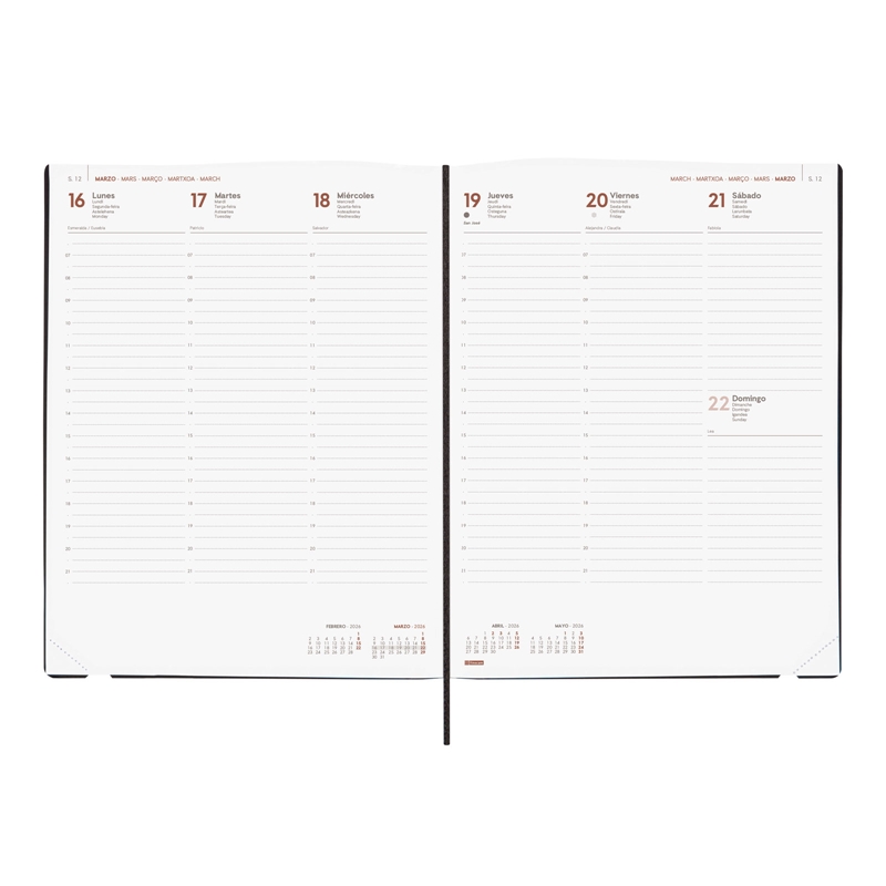 Agenda profesional encuadernada de tapa blanda. Tacto suave muy agradable. Estilo moderno y universal. Perfecta apertura para poder escribir cómodamente. Con goma elástica, cinta punto y esquinas microperforadas para localizar rápidamente el día/semana en curso. Contiene información de interés en la anualidad y otros contenidos extra. Gran formato, ideal para negocios: restaurantes, peluquerías, etc. Duración: Enero 2026 – Diciembre 2026 (12 meses). Interior: Semana Vista Vertical. Visión de la semana completa en vertical. Con medias horas. Con información de los festivos de España. La anualidad contiene: onomástica, festivos nacionales, cambios de estación e inicios de los años nuevos chino, musulmán, ortodoxo y hebreo. Dispone de contenidos extra: datos personales, horarios, fechas para destacar, calendarios, plan anual (2 años), planificación de viajes, festivos nacionales y de las CC. AA., festivos internacionales, usos del teclado, cómo buscar en Google, mapa de Europa y de husos horarios, hojas para anotaciones y tareas, y hojas para teléfonos, direcciones y e-mails. Artículo en español con anualidad multilingüe: español, francés, portugués, euskera e inglés. Formato: Y12 – 210×270 mm. Poliuretano flexible y papel. 80 g/m². Papel FSC®.