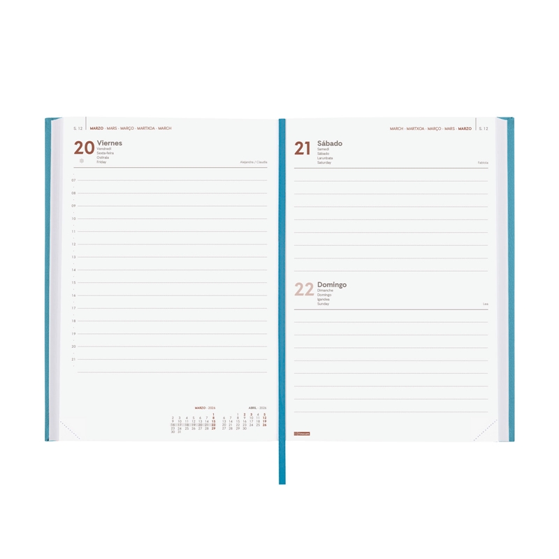 Agenda profesional encuadernada de estilo clásico y elegante. Tapa dura acolchada de polipiel. Perfecta apertura para poder escribir cómodamente. Con cinta punto y esquinas microperforadas para localizar rápidamente el día/semana en curso. Contiene información de interés en la anualidad y otros contenidos extra. Formato similar a DIN A5; con las ventajas de una agenda portable y una de sobremesa. Duración: Enero 2026 – Diciembre 2026 (12 meses). Interior: 1 Día Página. Amplio espacio de escritura para cada día. Con horas. Con información de los festivos de España. La anualidad contiene: onomástica, festivos nacionales, cambios de estación e inicios de los años nuevos chino, musulmán, ortodoxo y hebreo. Dispone de contenidos extra: datos personales, horarios, fechas para destacar, calendarios, plan anual (2 años), planificación de viajes, festivos nacionales y de las CC. AA., festivos internacionales, usos del teclado, cómo buscar en Google, mapa de Europa y de husos horarios, hojas para anotaciones y tareas, y hojas para teléfonos, direcciones y e-mails. Artículo en español con anualidad multilingüe: español, francés, portugués, euskera e inglés. Formato: Y10 – 140×204 mm. Tapa de cartón espumado forrado con poliuretano termovirante y papel. 80 g/m². Papel FSC®.