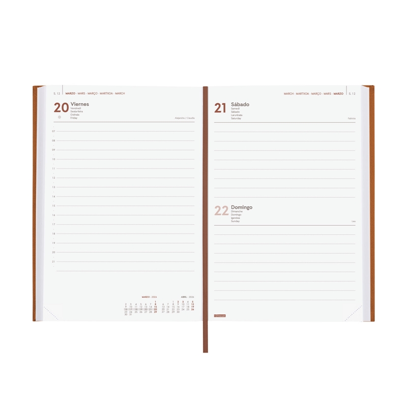 Agenda profesional encuadernada de estilo clásico y elegante. Tapa dura acolchada de polipiel. Perfecta apertura para poder escribir cómodamente. Con cinta punto y esquinas microperforadas para localizar rápidamente el día/semana en curso. Contiene información de interés en la anualidad y otros contenidos extra. Formato similar a DIN A5; con las ventajas de una agenda portable y una de sobremesa. Duración: Enero 2026 – Diciembre 2026 (12 meses). Interior: 1 Día Página. Amplio espacio de escritura para cada día. Con horas. Con información de los festivos de España. La anualidad contiene: onomástica, festivos nacionales, cambios de estación e inicios de los años nuevos chino, musulmán, ortodoxo y hebreo. Dispone de contenidos extra: datos personales, horarios, fechas para destacar, calendarios, plan anual (2 años), planificación de viajes, festivos nacionales y de las CC. AA., festivos internacionales, usos del teclado, cómo buscar en Google, mapa de Europa y de husos horarios, hojas para anotaciones y tareas, y hojas para teléfonos, direcciones y e-mails. Artículo en español con anualidad multilingüe: español, francés, portugués, euskera e inglés. Formato: Y10 – 140×204 mm. Tapa de cartón espumado forrado con poliuretano termovirante y papel. 80 g/m². Papel FSC®.