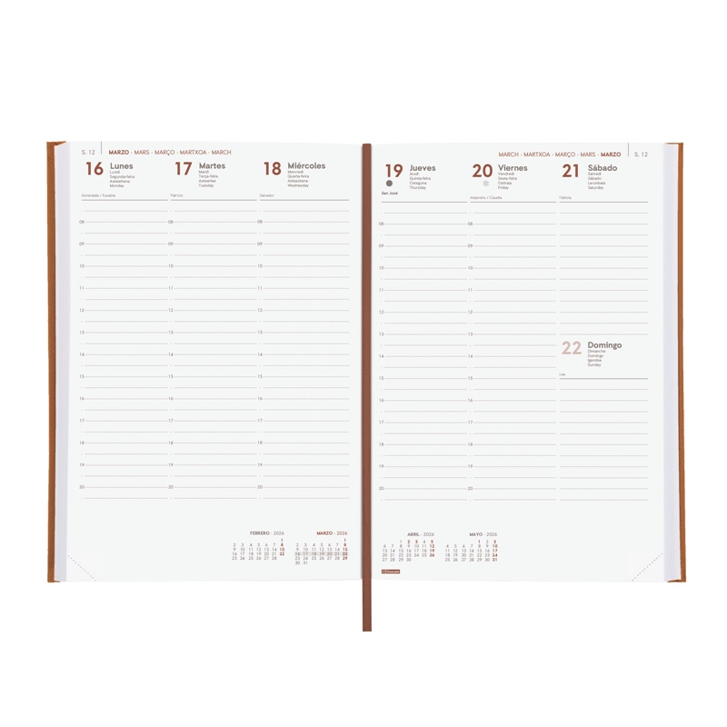 Agenda profesional encuadernada de estilo clásico y elegante. Tapa dura acolchada de polipiel. Perfecta apertura para poder escribir cómodamente. Con cinta punto y esquinas microperforadas para localizar rápidamente el día/semana en curso. Contiene información de interés en la anualidad y otros contenidos extra. Formato profesional de sobremesa que permite guardar papeles DIN A5 o DIN A4 doblados sin que sobresalgan de la agenda. Duración: Enero 2026 – Diciembre 2026 (12 meses). Interior: Semana Vista Vertical. Visión de la semana completa en vertical. Con medias horas. Con información de los festivos de España. La anualidad contiene: onomástica, festivos nacionales, cambios de estación e inicios de los años nuevos chino, musulmán, ortodoxo y hebreo. Dispone de contenidos extra: datos personales, horarios, fechas para destacar, calendarios, plan anual (2 años), planificación de viajes, festivos nacionales y de las CC. AA., festivos internacionales, usos del teclado, cómo buscar en Google, mapa de Europa y de husos horarios, hojas para anotaciones y tareas, y hojas para teléfonos, direcciones y e-mails. Artículo en español con anualidad multilingüe: español, francés, portugués, euskera e inglés. Formato: Y11 – 165×240 mm. Tapa de cartón espumado forrado con poliuretano termovirante y papel. 80 g/m². Papel FSC®.