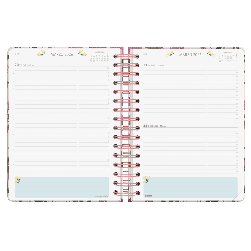 Agenda de tapa dura de cartón forrado con peliculado mate antirrayaduras. Con espiral doble, goma elástica y esquinas microperforadas para localizar rápidamente el día/semana en curso. Esta agenda se ha creado en colaboración con la diseñadora e ilustradora Moniquilla, obteniendo unas agendas bonitas y funcionales. Con una estética limpia y minimalista, contiene información de interés en la anualidad y otros contenidos extra. Además, dispone de dos marcapáginas y de adhesivos temáticos orientados a la organización personal. Formato similar a DIN A5; con las ventajas de una agenda portable y una de sobremesa. Duración: Enero 2026 – Diciembre 2026 (12 meses). Interior: 1 Día Página. Amplio espacio de escritura para cada día. Dos líneas por hora. Con espacio en el lateral derecho para anotar las tareas del día no asociadas a una hora en concreto. Con planificación mensual cuadriculada al inicio de cada mes.Con información de los festivos de España. La anualidad de la agenda incluye: festivos nacionales, cambios de estación y días señalados. Contiene planificación mensual cuadriculada con las fases lunares intercalada en la anualidad. La agenda también dispone de otros contenidos extra: datos personales, calendarios, planificación anual en columnas, horarios, objetivos personales, planes, maleta, apartado para libros/películas/series/pódcast, hojas para anotaciones y tareas, contactos, adhesivos temáticos y dos marcapáginas. Idioma del artículo: español. Formato: E10 – 155×212 mm. Tapas de cartón forrado con peliculado mate antirrayaduras. Espiral doble metálica. Papel. 80 g/m². Papel FSC®.