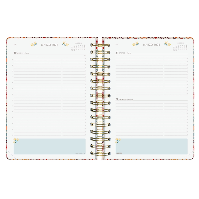 Agenda de tapa dura de cartón forrado con peliculado mate antirrayaduras. Con espiral doble, goma elástica y esquinas microperforadas para localizar rápidamente el día/semana en curso. Esta agenda se ha creado en colaboración con la diseñadora e ilustradora Moniquilla, obteniendo unas agendas bonitas y funcionales. Con una estética limpia y minimalista, contiene información de interés en la anualidad y otros contenidos extra. Además, dispone de dos marcapáginas y de adhesivos temáticos orientados a la organización personal. Formato similar a DIN A5; con las ventajas de una agenda portable y una de sobremesa. Duración: Enero 2026 – Diciembre 2026 (12 meses). Interior: 1 Día Página. Amplio espacio de escritura para cada día. Dos líneas por hora. Con espacio en el lateral derecho para anotar las tareas del día no asociadas a una hora en concreto. Con planificación mensual cuadriculada al inicio de cada mes.Con información de los festivos de España. La anualidad de la agenda incluye: festivos nacionales, cambios de estación y días señalados. Contiene planificación mensual cuadriculada con las fases lunares intercalada en la anualidad. La agenda también dispone de otros contenidos extra: datos personales, calendarios, planificación anual en columnas, horarios, objetivos personales, planes, maleta, apartado para libros/películas/series/pódcast, hojas para anotaciones y tareas, contactos, adhesivos temáticos y dos marcapáginas. Idioma del artículo: español. Formato: E10 – 155×212 mm. Tapas de cartón forrado con peliculado mate antirrayaduras. Espiral doble metálica. Papel. 80 g/m². Papel FSC®.