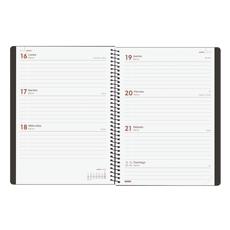 Agenda de espiral de estilo moderno y universal con tapa dura de cartón forrado con peliculado mate antirrayaduras. Ideal para uso personal y/o profesional. Con goma elástica. Esquinas microperforadas para localizar rápidamente el día/semana en curso. Contiene información de interés en la anualidad y otros contenidos extra. Formato similar a DIN A5; con las ventajas de una agenda portable y una de sobremesa. Duración: Enero 2026 – Diciembre 2026 (12 meses). Interior: Semana Vista Horizontal. Visión de la semana completa en horizontal que permite la escritura natural. Con espacio para concretar horario. Con información de los festivos de España. La anualidad de la agenda incluye la información relativa a: onomástica, festivos nacionales, cambios de estación e inicios de los años nuevos chino, musulmán, ortodoxo y hebreo. La agenda dispone también de otros contenidos extra: datos personales, horarios, calendarios, planificación anual del año y del año siguiente, festivos internacionales, cómo buscar en Google, usos del teclado, mapa de Europa y de los husos horarios, hojas para notas y hojas para teléfonos, direcciones y e-mails. Idioma del artículo: español. Formato: E10 – 155×212 mm. Tapas de cartón forrado con peliculado mate antirrayaduras, espiral simple metálica y papel. 80 g/m². Papel FSC®.