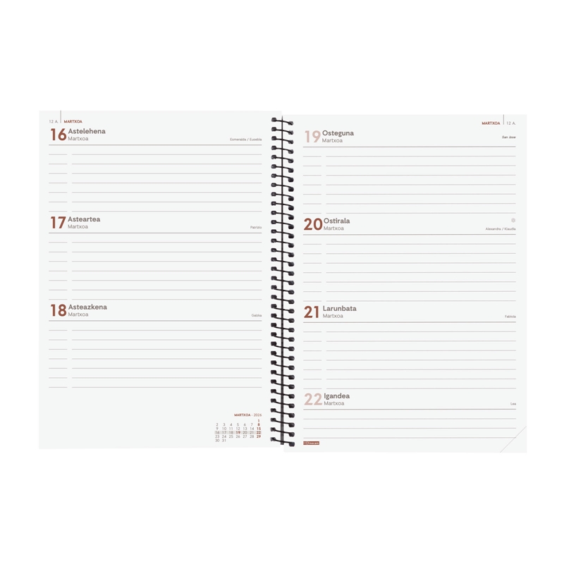 Agenda de espiral de estilo moderno y universal con tapas ligeras de polipropileno. Con goma elástica. Con esquinas microperforadas para localizar rápidamente el día/semana en curso. Agenda con información de interés en la anualidad y otros contenidos extra. Formato similar a DIN A5; con las ventajas de una agenda portable y una de sobremesa. Duración: Enero 2026 – Diciembre 2026 (12 meses). Interior: Semana Vista Horizontal. Visión de la semana completa en horizontal que permite la escritura natural. Con espacio para concretar horario. Con información de los festivos del País Vasco. La anualidad de la agenda incluye la información relativa a: onomástica, festivos nacionales, cambios de estación e inicios de los años nuevos chino, musulmán, ortodoxo y hebreo. La agenda dispone también de otros contenidos extra: datos personales, horarios, calendarios, plan anual del año y del año siguiente, festivos internacionales, mapa de husos horarios, hojas para notas y hojas para teléfonos, direcciones y e-mails. Idioma del artículo: euskera. Formato: E10 – 155×212 mm. Tapas de polipropileno opaco, espiral simple metálica y papel. 80 g/m². Papel FSC®.