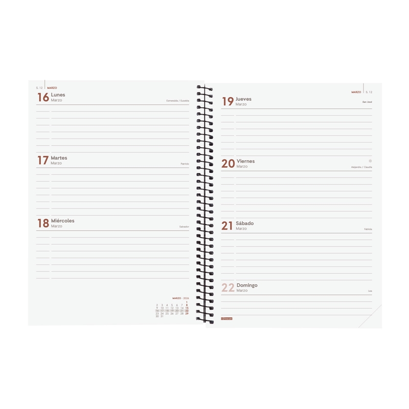 Agenda de espiral de estilo moderno y universal con tapas ligeras de polipropileno. Con goma elástica. Con esquinas microperforadas para localizar rápidamente el día/semana en curso. Agenda con información de interés en la anualidad y otros contenidos extra. Formato similar a DIN A5; con las ventajas de una agenda portable y una de sobremesa. Duración: Enero 2026 – Diciembre 2026 (12 meses). Interior: Semana Vista Horizontal. Visión de la semana completa en horizontal que permite la escritura natural. Con espacio para concretar horario. Con información de los festivos de España. La anualidad de la agenda incluye la información relativa a: onomástica, festivos nacionales, cambios de estación e inicios de los años nuevos chino, musulmán, ortodoxo y hebreo. La agenda dispone también de otros contenidos extra: datos personales, horarios, calendarios, planificación anual del año y del año siguiente, festivos internacionales, cómo buscar en Google, usos del teclado, mapa de Europa y de los husos horarios, hojas para notas y hojas para teléfonos, direcciones y e-mails. Idioma del artículo: español. Formato: E10 – 155×212 mm. Tapas de polipropileno opaco, espiral simple metálica y papel. 80 g/m². Papel FSC®.
