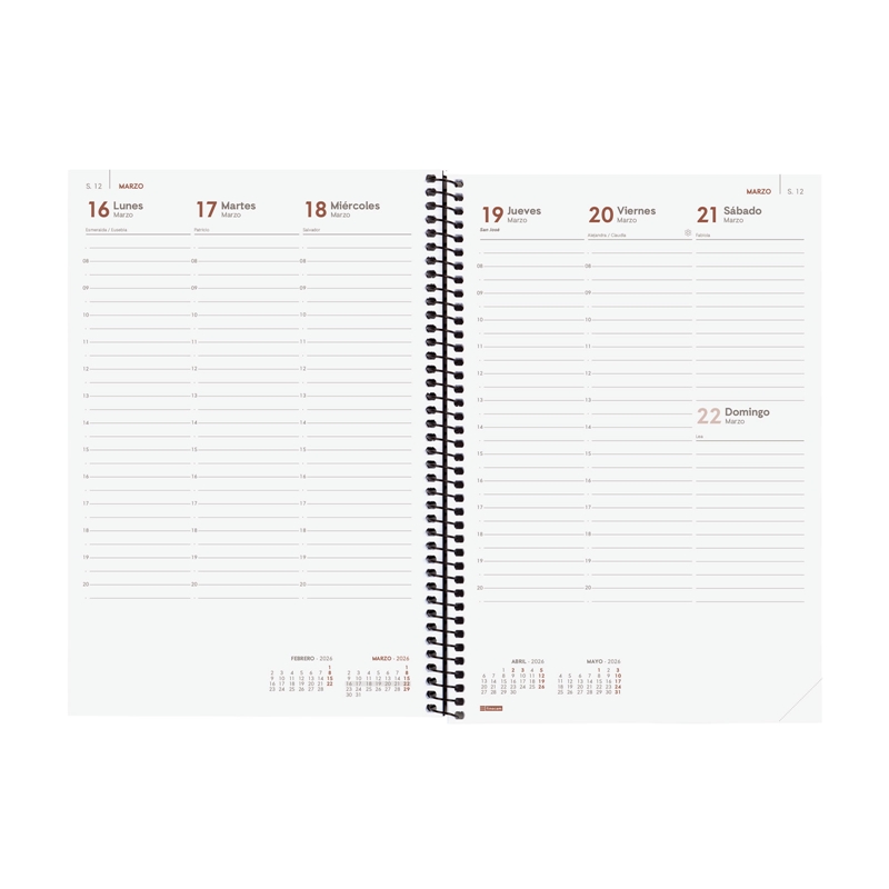 Agenda de espiral de estilo moderno y universal con tapas ligeras de polipropileno. Con goma elástica. Con esquinas microperforadas para localizar rápidamente el día/semana en curso. Agenda con información de interés en la anualidad y otros contenidos extra. Formato profesional de sobremesa que permite guardar papeles DIN A5 o DIN A4 doblados sin que sobresalgan de la agenda. Duración: Enero 2026 – Diciembre 2026 (12 meses). Interior: Semana Vista Vertical. Visión de la semana completa en vertical. Con medias horas. Con información de los festivos de España. La anualidad de la agenda incluye la información relativa a: onomástica, festivos nacionales, cambios de estación e inicios de los años nuevos chino, musulmán, ortodoxo y hebreo. La agenda dispone también de otros contenidos extra: datos personales, horarios, calendarios, planificación anual del año y del año siguiente, festivos internacionales, cómo buscar en Google, usos del teclado, mapa de Europa y de los husos horarios, hojas para notas y hojas para teléfonos, direcciones y e-mails. Idioma del artículo: español. Formato: E11 – 165×242 mm. Tapas de polipropileno opaco, espiral simple metálica y papel. 80 g/m². Papel FSC®.