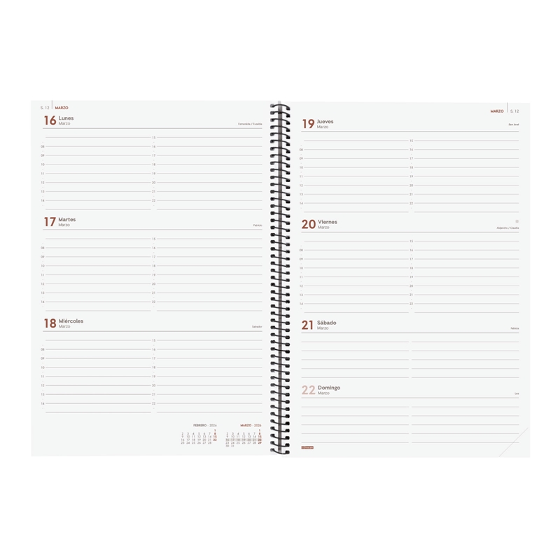 Agenda de espiral de estilo moderno y universal con tapas ligeras de polipropileno. Con goma elástica. Con esquinas microperforadas para localizar rápidamente el día/semana en curso. Agenda con información de interés en la anualidad y otros contenidos extra. Gran formato, ideal para negocios: restaurantes, peluquerías, etc. Duración: Enero 2026 – Diciembre 2026 (12 meses). Interior: Semana Vista Horizontal. Visión de la semana completa en horizontal. Cada día con horas dispuestas en dos columnas. Con información de los festivos de España. La anualidad de la agenda incluye la información relativa a: onomástica, festivos nacionales, cambios de estación e inicios de los años nuevos chino, musulmán, ortodoxo y hebreo. La agenda dispone también de otros contenidos extra: datos personales, horarios, calendarios, planificación anual del año y del año siguiente, festivos internacionales, cómo buscar en Google, usos del teclado, mapa de Europa y de los husos horarios, hojas para notas y hojas para teléfonos, direcciones y e-mails. Idioma del artículo: español. Formato: E40 – 210×297 mm. Tapas de polipropileno opaco, espiral simple metálica y papel. 80 g/m². Papel FSC®.