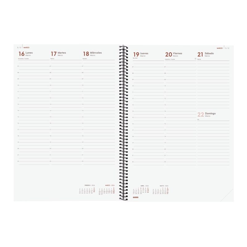 Agenda de espiral de estilo moderno y universal con tapas ligeras de polipropileno. Con goma elástica. Con esquinas microperforadas para localizar rápidamente el día/semana en curso. Agenda con información de interés en la anualidad y otros contenidos extra. Gran formato, ideal para negocios: restaurantes, peluquerías, etc. Duración: Enero 2026 – Diciembre 2026 (12 meses). Interior: Semana Vista Vertical. Visión de la semana completa en vertical. Con medias horas. Con información de los festivos de España. La anualidad de la agenda incluye la información relativa a: onomástica, festivos nacionales, cambios de estación e inicios de los años nuevos chino, musulmán, ortodoxo y hebreo. La agenda dispone también de otros contenidos extra: datos personales, horarios, calendarios, planificación anual del año y del año siguiente, festivos internacionales, cómo buscar en Google, usos del teclado, mapa de Europa y de los husos horarios, hojas para notas y hojas para teléfonos, direcciones y e-mails. Idioma del artículo: español. Formato: E40 – 210×297 mm. Tapas de polipropileno opaco, espiral simple metálica y papel. 80 g/m². Papel FSC®.