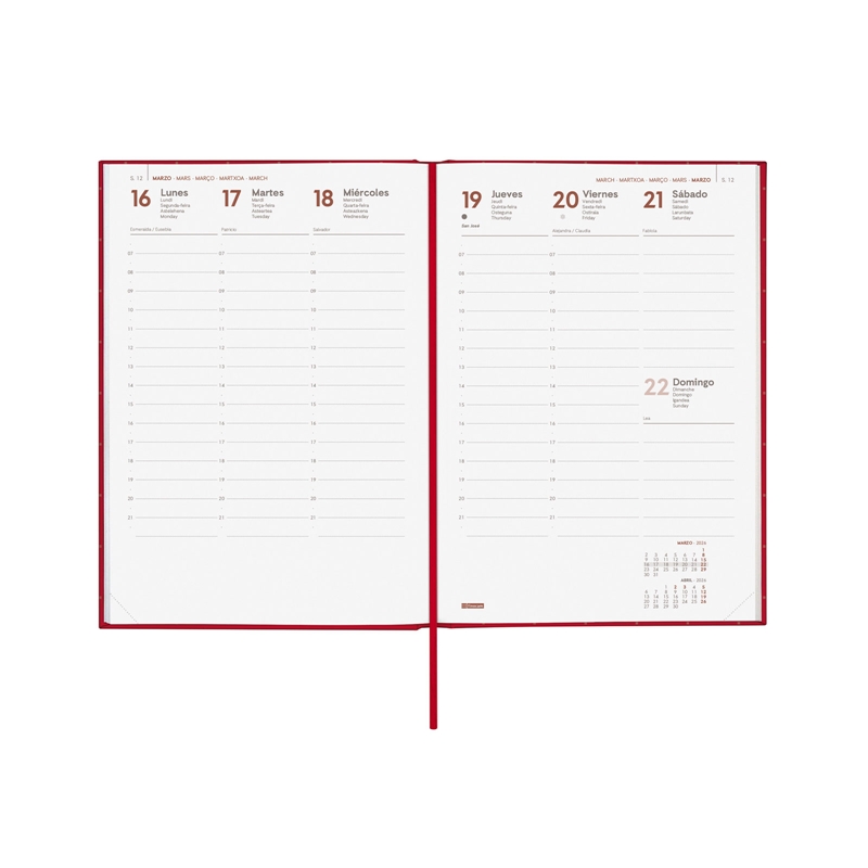 Agenda profesional encuadernada de estilo moderno. Tapa dura de cartón forrado con peliculado mate antirrayaduras. Perfecta apertura para poder escribir cómodamente. Con cinta punto y esquinas microperforadas para localizar rápidamente el día/semana en curso. Contiene información de interés en la anualidad y otros contenidos extra. Ideal para tu organización profesional y/o personal. Formato similar a DIN A5; con las ventajas de una agenda portable y una de sobremesa. Duración: Enero 2026 – Diciembre 2026 (12 meses). Interior: Semana Vista Vertical. Visión de la semana completa en vertical. Con horas. Con información de los festivos de España. La anualidad contiene: onomástica, festivos nacionales, cambios de estación e inicios de los años nuevos chino, musulmán, ortodoxo y hebreo. Dispone de contenidos extra: datos personales, horarios, fechas para destacar, calendarios, plan anual (2 años), planificación de viajes, festivos nacionales y de las CC. AA., festivos internacionales, usos del teclado, cómo buscar en Google, mapa de Europa y de husos horarios, hojas para anotaciones y tareas, y hojas para teléfonos, direcciones y e-mails. Artículo en español con anualidad multilingüe: español, francés, portugués, euskera e inglés. Formato: Y10 – 140×204 mm. Tapas de cartón forrado con peliculado mate antirrayaduras y papel. 80 g/m². Papel FSC®.