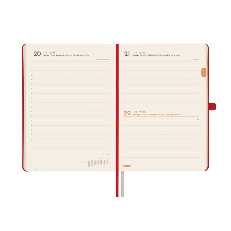 Agenda encuadernada de tapa dura de estilo moderno y universal. Material de tacto gomoso con sensación de textura. Perfecta apertura para poder escribir cómodamente. Con cinta punto, goma elástica y anilla portabolígrafo para llevar siempre contigo un elemento de escritura. Bolsillo interior con fuelle de papel tejido muy resistente al uso. Esquinas microperforadas para localizar rápidamente el día/semana en curso. Para facilitar la localización de cada mes, la anualidad incorpora un indicador en el lateral derecho de las páginas. Contiene información de interés en la anualidad y otros contenidos extra. Formato pequeño y práctico, fácil de transportar. Ideal para llevar contigo. Duración: Enero 2026 – Diciembre 2026 (12 meses). Interior: 1 Día Página. Amplio espacio de escritura para cada día. Con horas. Con información de los festivos de España. La anualidad de la agenda incluye la información relativa a la onomástica y a los festivos nacionales. La agenda dispone también de otros contenidos extra: datos personales, calendarios, horario, planificación anual en columnas, planificación mensual cuadriculada, fechas para destacar, hojas para tareas y anotaciones y hojas para teléfonos, direcciones y e-mails. Artículo en español con anualidad multilingüe: español, inglés, portugués, gallego, catalán y euskera. Formato: M4 – 118×168 mm. Poliuretano y papel. 80 g/m². Papel FSC®.