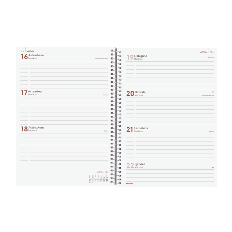 Agenda de espiral de estilo moderno. Con tapas ligeras de polipropileno y goma elástica. Ideal para uso personal y/o profesional. Esquinas microperforadas para localizar rápidamente el día/semana en curso. Agenda con información de interés en la anualidad y otros contenidos extra. Formato similar a DIN A5; con las ventajas de una agenda portable y una de sobremesa. Duración: Enero 2026 – Diciembre 2026 (12 meses). Interior: Semana Vista Horizontal. Visión de la semana completa en horizontal que permite la escritura natural. Con espacio para concretar horario. Con información de los festivos del País Vasco. La anualidad de la agenda incluye la información relativa a: onomástica, festivos nacionales, cambios de estación e inicios de los años nuevos chino, musulmán, ortodoxo y hebreo. La agenda dispone también de otros contenidos extra: datos personales, horarios, calendarios, plan anual del año y del año siguiente, festivos internacionales, mapa de husos horarios, hojas para notas y hojas para teléfonos, direcciones y e-mails. Idioma del artículo: euskera. Formato: E10 – 155×212 mm. Tapas de polipropileno, espiral simple metálica y papel. 80 g/m². Papel FSC®.