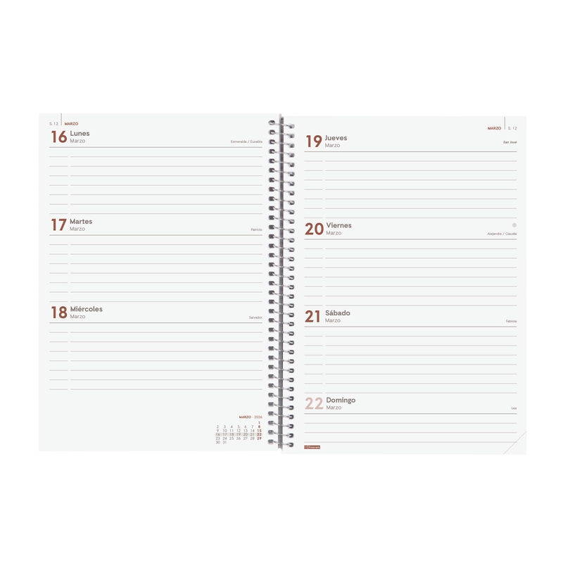 Agenda de espiral de estilo moderno. Con tapas ligeras de polipropileno y goma elástica. Ideal para uso personal y/o profesional. Esquinas microperforadas para localizar rápidamente el día/semana en curso. Agenda con información de interés en la anualidad y otros contenidos extra. Formato similar a DIN A5; con las ventajas de una agenda portable y una de sobremesa. Duración: Enero 2026 – Diciembre 2026 (12 meses). Interior: Semana Vista Horizontal. Visión de la semana completa en horizontal que permite la escritura natural. Con espacio para concretar horario. Con información de los festivos de España. La anualidad de la agenda incluye la información relativa a: onomástica, festivos nacionales, cambios de estación e inicios de los años nuevos chino, musulmán, ortodoxo y hebreo. La agenda dispone también de otros contenidos extra: datos personales, horarios, calendarios, planificación anual del año y del año siguiente, festivos internacionales, cómo buscar en Google, usos del teclado, mapa de Europa y de los husos horarios, hojas para notas y hojas para teléfonos, direcciones y e-mails. Idioma del artículo: español. Formato: E10 – 155×212 mm. Tapas de polipropileno, espiral simple metálica y papel. 80 g/m². Papel FSC®.