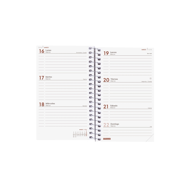 Agenda de espiral de estilo moderno. Con tapas ligeras de polipropileno y goma elástica. Ideal para uso personal y/o profesional. Esquinas microperforadas para localizar rápidamente el día/semana en curso. Agenda con información de interés en la anualidad y otros contenidos extra. Formato mini, ligero y liviano. Ideal para llevar siempre contigo. Duración: Enero 2026 – Diciembre 2026 (12 meses). Interior: Semana Vista Horizontal. Visión de la semana completa en horizontal que permite la escritura natural. Con espacio para concretar horario. Con información de los festivos de España. La anualidad de la agenda incluye la información relativa a: onomástica, festivos nacionales, cambios de estación e inicios de los años nuevos chino, musulmán, ortodoxo y hebreo. La agenda dispone también de otros contenidos extra: datos personales, horarios, calendarios, planificación anual del año y del año siguiente, festivos internacionales, cómo buscar en Google, usos del teclado, mapa de Europa y de los husos horarios, hojas para notas y hojas para teléfonos, direcciones y e-mails. Idioma del artículo: español. Formato: E3 – 79×127 mm. Tapas de polipropileno, espiral simple metálica y papel. 80 g/m². Papel FSC®.