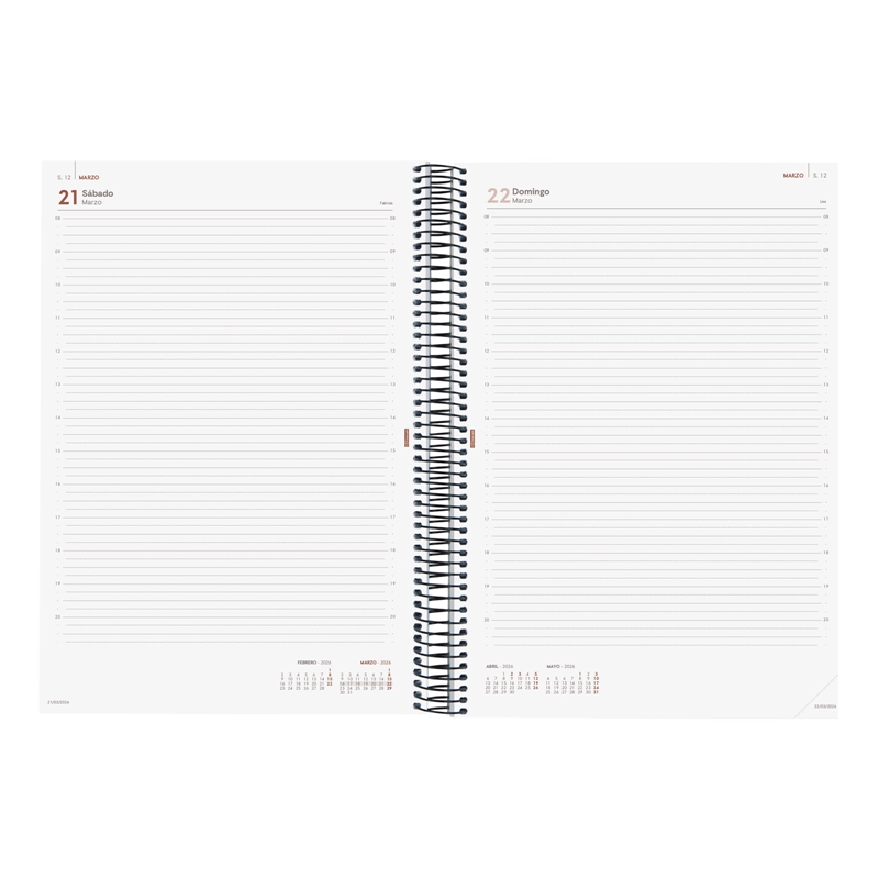 Agenda de espiral de estilo moderno. Con tapas ligeras de polipropileno y goma elástica. Ideal para uso personal y/o profesional. Esquinas microperforadas para localizar rápidamente el día/semana en curso. Agenda con información de interés en la anualidad y otros contenidos extra. Gran formato, ideal para negocios: restaurantes, peluquerías, etc. Puntero inferior con la fecha para identificar rápidamente el día del mes. Con doble goma elástica: una sirve de punto, la otra cierra la agenda. Duración: Enero 2026 – Diciembre 2026 (12 meses). Interior: 1 Día Página. Amplio espacio de escritura para cada día. Con cuartos de hora. Sábados y domingos en página completa. Con información de los festivos de España. La anualidad de la agenda incluye la información relativa a: onomástica, festivos nacionales, cambios de estación e inicios de los años nuevos chino, musulmán, ortodoxo y hebreo. La agenda dispone también de otros contenidos extra: datos personales, horarios, calendarios, planificación anual del año y del año siguiente, festivos internacionales, cómo buscar en Google, usos del teclado, mapa de Europa y de los husos horarios, hojas para notas y hojas para teléfonos, direcciones y e-mails. Idioma del artículo: español. Formato: E40 – 210×297 mm. Tapas de polipropileno, espiral simple metálica y papel. 70 g/m². Papel FSC®.
