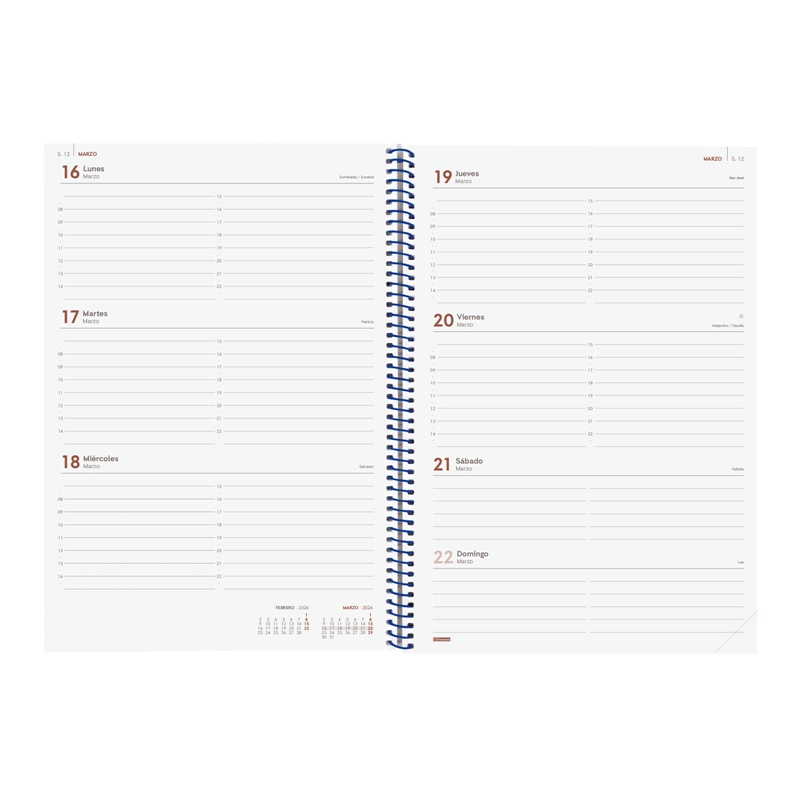 Agenda de espiral de estilo moderno. Con tapas ligeras de polipropileno y goma elástica. Ideal para uso personal y/o profesional. Esquinas microperforadas para localizar rápidamente el día/semana en curso. Agenda con información de interés en la anualidad y otros contenidos extra. Gran formato, ideal para negocios: restaurantes, peluquerías, etc. Duración: Enero 2026 – Diciembre 2026 (12 meses). Interior: Semana Vista Horizontal. Visión de la semana completa en horizontal. Cada día con horas dispuestas en dos columnas. Con información de los festivos de España. La anualidad de la agenda incluye la información relativa a: onomástica, festivos nacionales, cambios de estación e inicios de los años nuevos chino, musulmán, ortodoxo y hebreo. La agenda dispone también de otros contenidos extra: datos personales, horarios, calendarios, planificación anual del año y del año siguiente, festivos internacionales, cómo buscar en Google, usos del teclado, mapa de Europa y de los husos horarios, hojas para notas y hojas para teléfonos, direcciones y e-mails. Idioma del artículo: español. Formato: E40 – 210×297 mm. Tapas de polipropileno, espiral simple metálica y papel. 80 g/m². Papel FSC®.