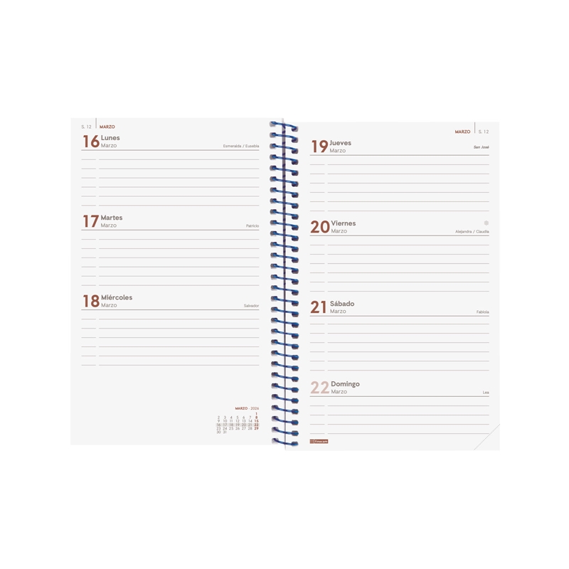 Agenda de espiral de estilo moderno. Con tapas ligeras de polipropileno y goma elástica. Ideal para uso personal y/o profesional. Esquinas microperforadas para localizar rápidamente el día/semana en curso. Agenda con información de interés en la anualidad y otros contenidos extra. Ideal para llevar contigo, compaginando los temas personales y profesionales. Duración: Enero 2026 – Diciembre 2026 (12 meses). Interior: Semana Vista Horizontal. Visión de la semana completa en horizontal que permite la escritura natural. Con espacio para concretar horario. Con información de los festivos de España. La anualidad de la agenda incluye la información relativa a: onomástica, festivos nacionales, cambios de estación e inicios de los años nuevos chino, musulmán, ortodoxo y hebreo. La agenda dispone también de otros contenidos extra: datos personales, horarios, calendarios, planificación anual del año y del año siguiente, festivos internacionales, cómo buscar en Google, usos del teclado, mapa de Europa y de los husos horarios, hojas para notas y hojas para teléfonos, direcciones y e-mails. Idioma del artículo: español. Formato: E5 – 117×181 mm. Tapas de polipropileno, espiral simple metálica y papel. 80 g/m². Papel FSC®.