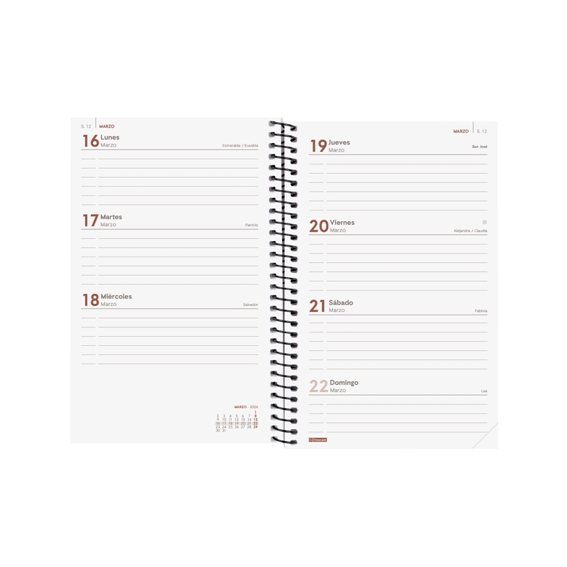 Agenda de espiral de estilo moderno. Con tapas ligeras de polipropileno y goma elástica. Ideal para uso personal y/o profesional. Esquinas microperforadas para localizar rápidamente el día/semana en curso. Agenda con información de interés en la anualidad y otros contenidos extra. Ideal para llevar contigo, compaginando los temas personales y profesionales. Duración: Enero 2026 – Diciembre 2026 (12 meses). Interior: Semana Vista Horizontal. Visión de la semana completa en horizontal que permite la escritura natural. Con espacio para concretar horario. Con información de los festivos de España. La anualidad de la agenda incluye la información relativa a: onomástica, festivos nacionales, cambios de estación e inicios de los años nuevos chino, musulmán, ortodoxo y hebreo. La agenda dispone también de otros contenidos extra: datos personales, horarios, calendarios, planificación anual del año y del año siguiente, festivos internacionales, cómo buscar en Google, usos del teclado, mapa de Europa y de los husos horarios, hojas para notas y hojas para teléfonos, direcciones y e-mails. Idioma del artículo: español. Formato: E5 – 117×181 mm. Tapas de polipropileno, espiral simple metálica y papel. 80 g/m². Papel FSC®.