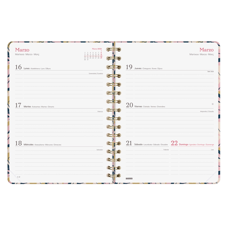 Agenda de espiral con tapa dura de cartón forrado con peliculado mate antirrayaduras. Diseño elegante y en tendencia con detalles estampados metalizados. Ideal para uso personal y/o profesional. Con goma elástica y esquinas microperforadas para localizar rápidamente el día/semana en curso. El diseño interior es limpio y fácil, con espacio suficiente para organizar tus proyectos, tareas y compromisos. Contiene información de interés en la anualidad y otros extra para la organización personal. Además, incorpora un set de adhesivos temáticos. Formato similar a DIN A5; con las ventajas de una agenda portable y una de sobremesa. Duración: Enero 2026 – Diciembre 2026 (12 meses). Interior: Semana Vista Horizontal. Visión de la semana completa en horizontal que permite la escritura natural. Con espacio para concretar horario. Con información de los festivos de España. La anualidad de la agenda incluye la información relativa a: onomástica, festivos nacionales, cambios de estación e inicios de los años nuevos chino, musulmán, ortodoxo y hebreo. La agenda dispone también de otros contenidos extra: datos personales, calendarios, horarios, objetivos del año, plan anual, fechas importantes, otras fechas, hojas para checklist, hojas para notas, hoja para ocio, hojas para teléfonos, direcciones y e-mails y dos hojas de pegatinas orientadas a la organización personal. Artículo en español con anualidad multilingüe: español, euskera, gallego y catalán. Formato: E10 – 155×212 mm. Tapas de cartón forrado con peliculado mate antirrayaduras. Espiral doble metálica. Papel. 80 g/m². Papel FSC®.