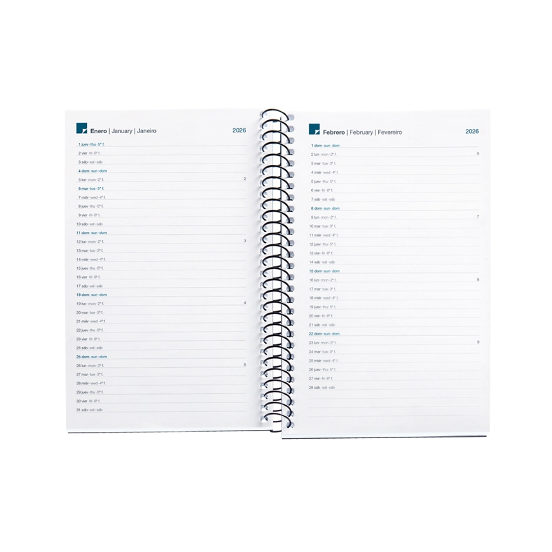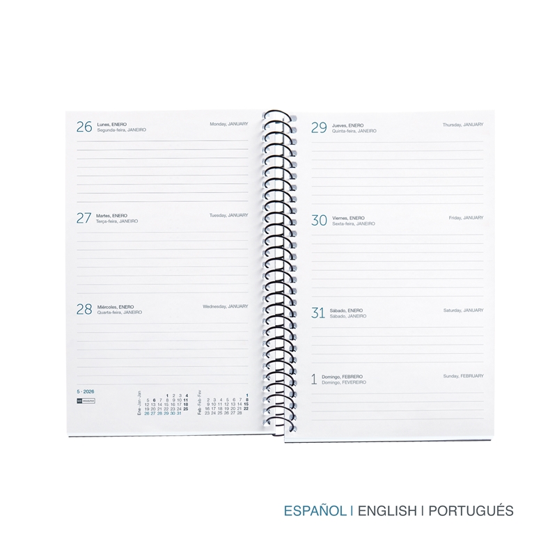Cubiertas espiraladas de cartón forrado y plastificado mate. Detalles en stamping negro. Papel color marfil de 80 g/m², FSC Mix Credit. Tamaño: Activa 117 x 182 mm. Anualidad: Semana a la vista horizontal (S/V), de Enero a Diciembre 2026. Idiomas: Castellano – Inglés – Portugués. Encuadernación cosida con cinta marcador. Bolsillo interior. Goma elástica para cerrar. Goma portabolígrafos. Contenido: Contenido: Anualidad semana a la vista horizontal, hoja de datos personales, recomendaciones, calendario bimensual en cada doble página, hojas para notas, hojas para direcciones. Festivos nacionales. Iconos que indican: cambio horario, inicio estaciones, año nuevo chino, carnaval y lluvia de estrellas (entre otros).