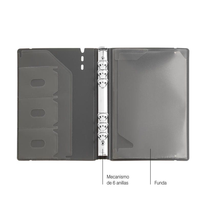 Agenda de 6 anillas fabricada en poliuretano rígido. Incluye anualidad semana vista. Papel 80 g/m2, FSC Mix Credit. Tamaño: Activa 117 x 182 mm. Anualidad: Semana a la vista vertical. Idiomas: Castellano. Contenido: Departamento para tarjetas de visita, crédito, etc. Funda tarjetones. 4 separadores de identificación. Mecanismo de 6 anillas.