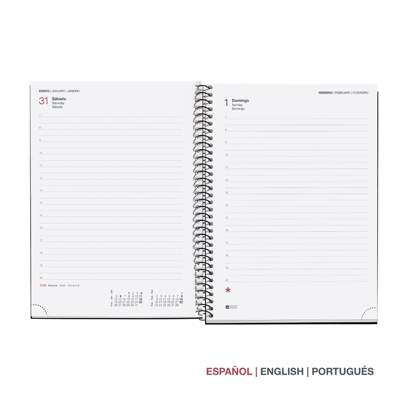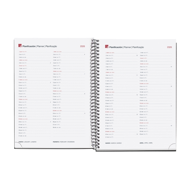 Cubiertas espiraladas de polipropileno opaco. Año serigrafiado. Papel extra opaco 80 g/m², FSC Mix Credit. Tamaño: Plus 155 x 213 mm. Anualidad: Día por página (D/P), de Enero a Diciembre 2026. Idiomas: Castellano – Inglés – Portugués. Encuadernación espiral. Hojas microperforadas en la esquina para señalar la fecha actual. Contenido: Contenido: Anualidad día por página (sábado y domingo en página completa), hoja de datos personales, calendarios 3 años, calendario bimensual en cada doble página, recomendaciones, fechas a recordar, planning mensual, hojas para notas y hojas para direcciones. Festivos nacionales y portugueses. Iconos que indican: cambio horario, inicio estaciones, año nuevo chino, carnaval y lluvia de estrellas (entre otros).