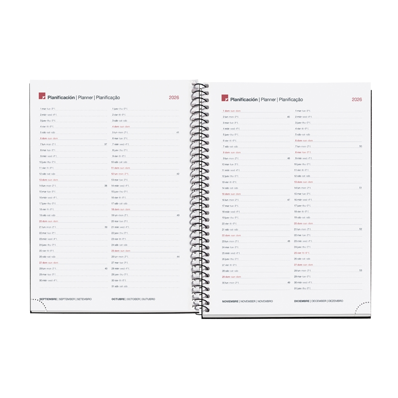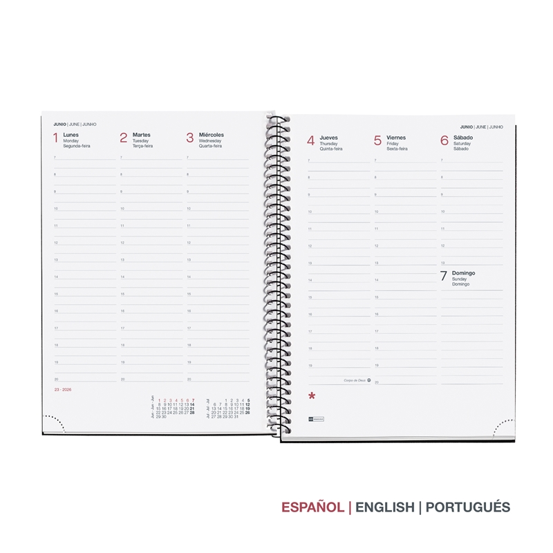 Cubiertas espiraladas de cartón 100% reciclado. Papel 100% reciclado post-consumo de 80g/m². con certificado Blue Angel y EU Label. Tamaño: Plus 155 x 213 mm. Anualidad: Semana a la vista vertical S/VV, de Enero a Diciembre 2026. Idiomas: Castellano – Inglés – Portugués. Encuadernación espiral. Hojas microperforadas en la esquina para señalar la fecha actual. Goma elástica para cerrar. Contenido: Anualidad semana a la vista vertical, hoja de datos personales, calendarios 3 años, calendario bimensual en cada doble página, recomendaciones, fechas a recordar, planning mensual, hojas para notas y hojas para direcciones. Festivos nacionales y portugueses. Iconos que indican: cambio horario, inicio estaciones, año nuevo chino, carnaval y lluvia de estrellas (entre otros).
