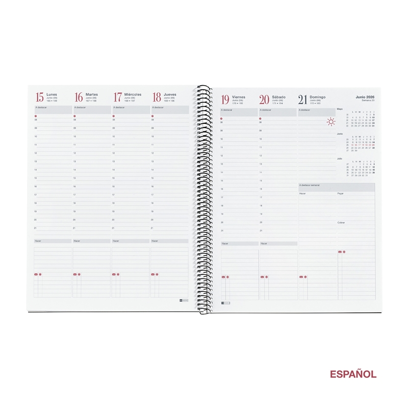 Cubiertas espiraladas de polipropileno opaco. Año serigrafiado. Papel extra opaco 80 g/m², FSC Mix Credit. Tamaño: Pro 210 x 270 mm Anualidad: Semana a la vista vertical (S/VV) de Enero a Diciembre 2026. Idiomas: Castellano – Inglés – Portugués. Encuadernación espiral. Hojas microperforadas en la esquina para señalar la fecha actual. Contenido: Anualidad semana a la vista vertical, hoja de datos personales, calendario trimestral en cada doble página, calendarios 3 años, recomendaciones, horario semanal, fechas a recordar, planning mensual, onomástica, días festivos, conversiones medidas, temperaturas internacionales, diferencias horarias internacionales, tallas internacionales, distancias kilométricas, 16 páginas de notas, regla, espacio destacados. Iconos que indican: cambio horario, inicio de estaciones, año nuevo chino, carnaval y lluvia de estrellas (entre otros).