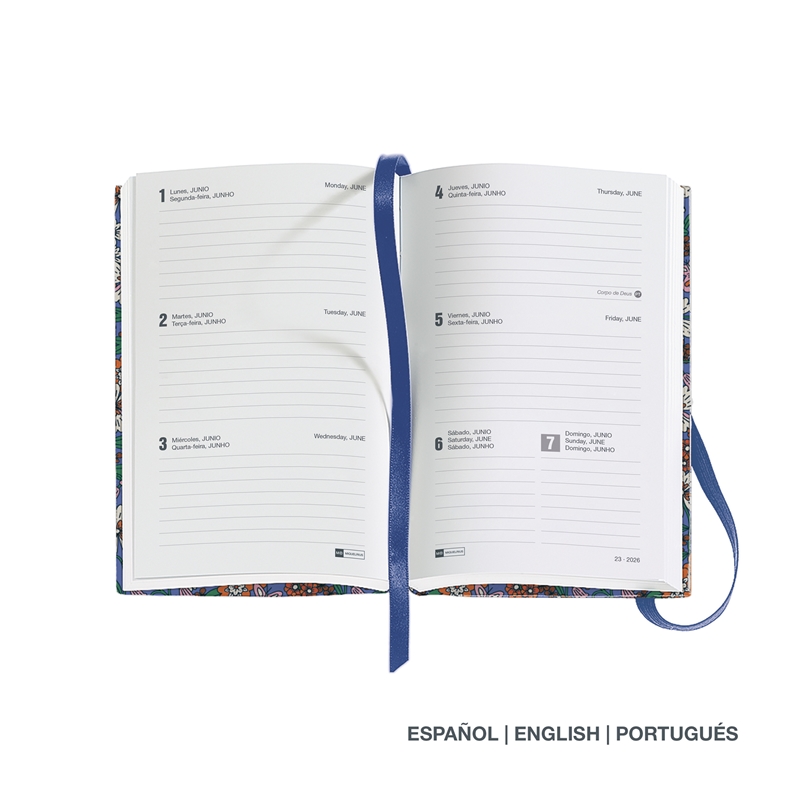 Cubiertas cosidas rigidas de cartón forrado, plastificado mate. Papel color marfil de 80 g/m², FSC Mix Credit. Tamaño: Passport 90 x 140 mm. Anualidad: Semana a la vista horizontal (S/V), de Enero a Diciembre 2026. Idiomas: Castellano – Inglés – Portugués. Encuadernación cosida con cinta marcador. Bolsillo interior. Goma elástica para cerrar. Goma portabolígrafos. Contenido: Anualidad semana a la vista horizontal, hoja de datos personales, calendario 2 años, planning mensual, hojas para notas y hojas para direcciones. Festivos nacionales y portugueses. Iconos que indican: cambio horario, inicio estaciones, año nuevo chino, carnaval y lluvia de estrellas (entre otros).