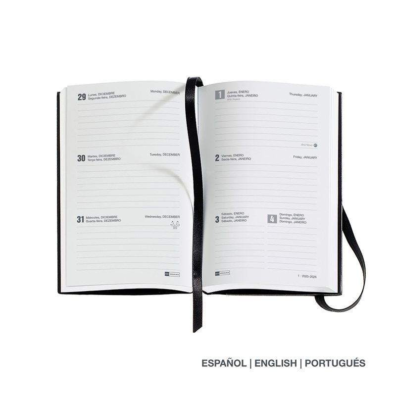 Cubiertas cosidas de símil piel (poliuretano). Papel 80 g/m², FSC Mix Credit. Tamaño: Passport 90 x 140 mm. Anualidad: Semana a la vista horizontal (S/V), de Enero a Diciembre 2026. Idiomas: Castellano – Inglés – Portugués. Encuadernación cosida con cinta marcador. Goma elástica para cerrar. Contenido: Anualidad semana a la vista horizontal, hoja de datos personales, calendario 2 años, planning mensual, calendario mensual en cada doble página, hojas para notas y hojas para direcciones. Festivos nacionales y portugueses. Iconos que indican: cambio horario, inicio estaciones, año nuevo chino, carnaval y lluvia de estrellas (entre otros).