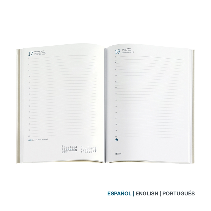 Cubiertas cosidas rigidas de cartón forrado, plastificado mate. Papel color marfil de 80 g/m², FSC Mix Credit. Tamaño: Plus 155 x 213 mm. Anualidad: Día por página (D/P), de Enero a Diciembre 2026. Idiomas: Castellano – Inglés – Portugués. Encuadernación cosida con cinta marcador. Bolsillo interior. Goma elástica para cerrar. Goma portabolígrafos. Contenido: Anualidad día por página (sábado y domingo en página completa), hoja de datos personales, calendarios 3 años, calendario bimensual en cada doble página, recomendaciones, fechas a recordar, planning mensual, hojas para notas y hojas para direcciones. Festivos nacionales y portugueses. Iconos que indican: cambio horario, inicio estaciones, año nuevo chino, carnaval y lluvia de estrellas (entre otros).
