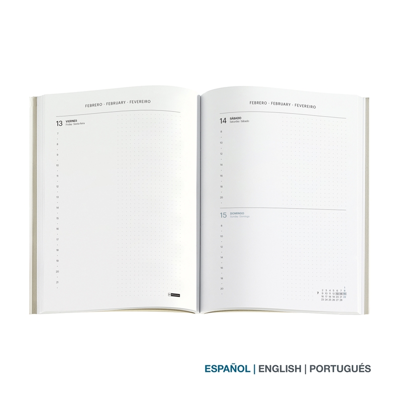 Esta colección expresa el minimalismo a través de su propuesta monocromática que destaca por su diseño exclusivo y su cuidada confección. Una combinación entre elegancia y simplicidad, pensada para quienes buscan originalidad con un estilo atemporal. Características: Cubiertas cosidas de símil piel (poliuretano) con acabado gomoso. Cortes tintados a tono con la cubierta y cierre con goma del mismo color. Anualidad: Día Página (D/P). 12 meses. Papel: 100 g/m², FSC Mix Credit. Idiomas: Castellano – Inglés – Portugués. Tamaño: Plus (155 x 213 mm). Contenido: Calendario bianual. Planning anual 2026 y 2027. Planning mensual a la entrada de cada mes. Espacio para tomar notas.