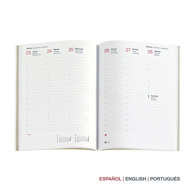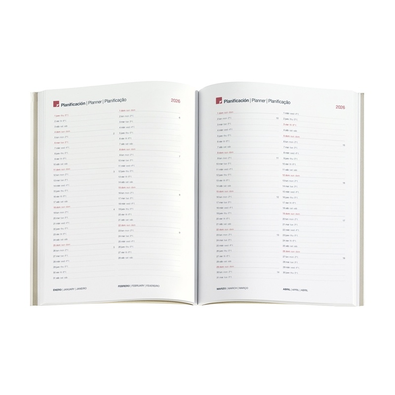 Cubiertas cosidas de símil piel (poliuretano). Papel 80 g/m², FSC Mix Credit. Tamaño: Plus 155 x 213 mm. Anualidad: Semana a la vista (anualidad vertical S/VV), de Enero a Diciembre 2026. Idiomas: Castellano – Inglés – Portugués. Encuadernación cosida con cinta marcador. Contenido: Anualidad semana a la vista vertical, hoja de datos personales, calendarios 3 años, calendario bimensual en cada doble página, recomendaciones, fechas a recordar, planning mensual, hojas para notas y hojas para direcciones. Festivos nacionales y portugueses. Iconos que indican: cambio horario, inicio estaciones, año nuevo chino, carnaval y lluvia de estrellas (entre otros).