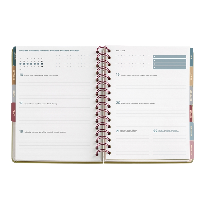 Agenda diseñada por Arno Dufour Design Studio. Con una sólida trayectoria en animación, publicidad y diseño textil, su trabajo se distingue por un estilo delicado, sensible y minimalista. Siluetas sutiles, motivos botánicos y técnicas como la tinta, el estampado y el collage se combinan para crear un universo visual único. Ese mismo universo cobra vida en esta colección de agendas: piezas pensadas para inspirar, organizar y acompañar tu día a día con belleza y calma. Características: Cubiertas de cartón forrado de papel impreso y plastificado mate. Detalles en stamping dorado. Encuadernación en Wire-O. Cierre con goma. Anualidad: Día Página (D/P). 12 meses. Papel: Papel: 100 g/m², FSC Mix Credit. Idiomas: Inglés – Castellano – Portugués – Italiano – Francés – Alemán. Tamaño: Plus D/P: 164 x 218 mm. Contenido: Datos Personales. Calendario del año. Planning mensual en cada entrada de mes. Seguimiento de hábitos saludables, prioridades, y fechas importantes. 12 separadores que incluyen frase inspiradora y pestañas plastificadas. Hojas de notas. Incluye 2 hojas de adhesivos.