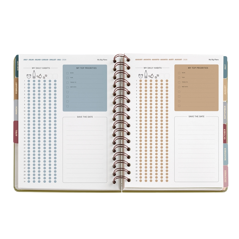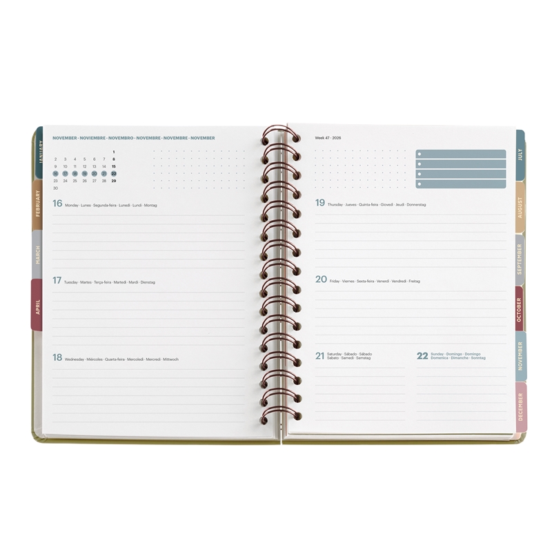 Agenda diseñada por Arno Dufour Design Studio. Con una sólida trayectoria en animación, publicidad y diseño textil, su trabajo se distingue por un estilo delicado, sensible y minimalista. Siluetas sutiles, motivos botánicos y técnicas como la tinta, el estampado y el collage se combinan para crear un universo visual único. Ese mismo universo cobra vida en esta colección de agendas: piezas pensadas para inspirar, organizar y acompañar tu día a día con belleza y calma. Características: Cubiertas de cartón forrado de papel impreso y plastificado mate. Detalles en stamping anaranjado. Encuadernación en Wire-O. Cierre con goma. Anualidad: Semana Vista (S/V). 12 meses. Papel: Papel: 100 g/m², FSC Mix Credit. Idiomas: Inglés – Castellano – Portugués – Italiano – Francés – Alemán. Tamaño: Plus S/V: 160 x 218 mm. Contenido: Datos Personales. Calendario del año. Planning mensual en cada entrada de mes. Seguimiento de hábitos saludables, prioridades, y fechas importantes. 12 separadores que incluyen frase inspiradora y pestañas plastificadas. Hojas de notas. Incluye 2 hojas de adhesivos.