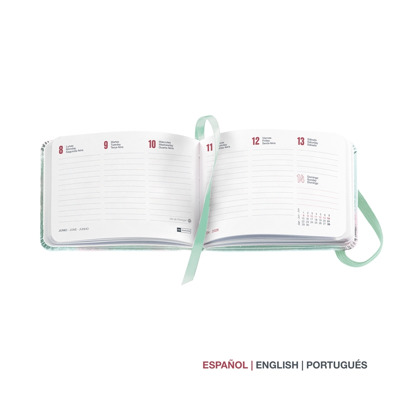 Cubiertas cosidas rigidas de cartón forrado, plastificado mate. Papel color marfil de 80 g/m², FSC Mix Credit. Tamaño: Pocket 105 x 74 mm. Anualidad: Semana a la vista vertical (S/VV), de Enero a Diciembre 2026. Idiomas: Castellano – Inglés – Portugués. Encuadernación cosida con cinta marcador. Bolsillo interior. Goma elástica para cerrar. Contenido: Anualidad semana a la vista, datos personales, calendarios 3 años, planning mensual y hojas para notas.