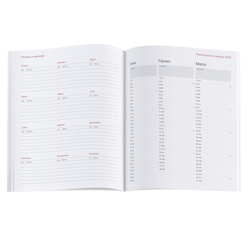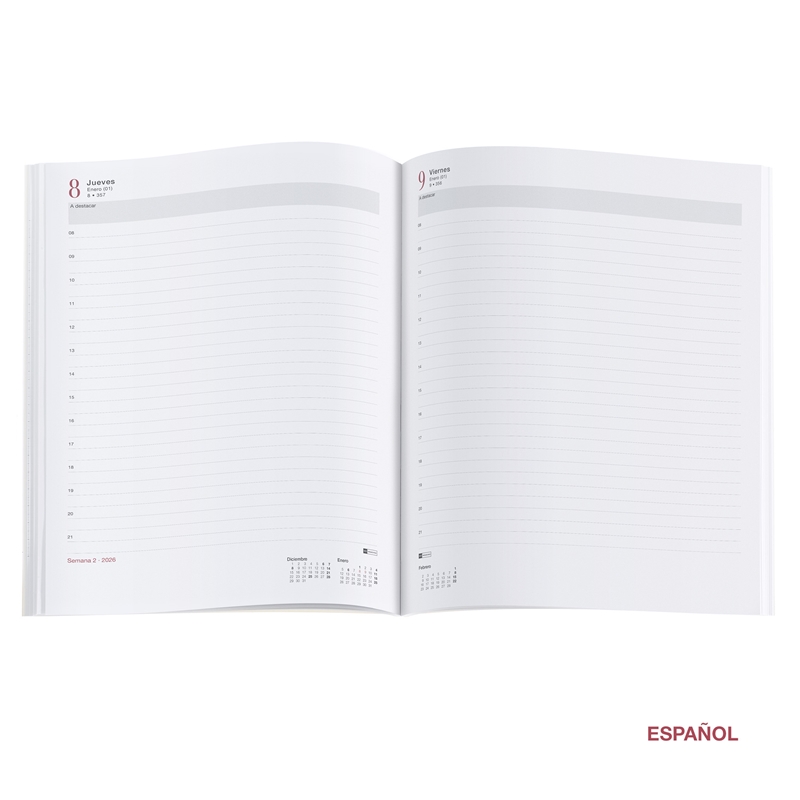 Cubiertas cosidas de símil piel (poliuretano). Papel 80 g/m², FSC Mix Credit. Tamaño: Pro 210 x 270 mm. Anualidad: Día por página (D/P) de Enero a Diciembre 2026. Idiomas: Castellano Encuadernación cosida con cinta marcador. Contenido: Anualidad día por página (sábado y domingo en página completa), hoja de datos personales, calendario trimestral en cada doble página, calendarios 3 años, recomendaciones, horario semanal, fechas a recordar, planning mensual, onomástica, días festivos, conversiones medidas, temperaturas internacionales, diferencias horarias internacionales, tallas internacionales, distancias kilométricas, 16 páginas de notas, regla, espacio destacados. Iconos que indican: cambio horario, inicio de estaciones, año nuevo chino, carnaval y lluvia de estrellas (entre otros).