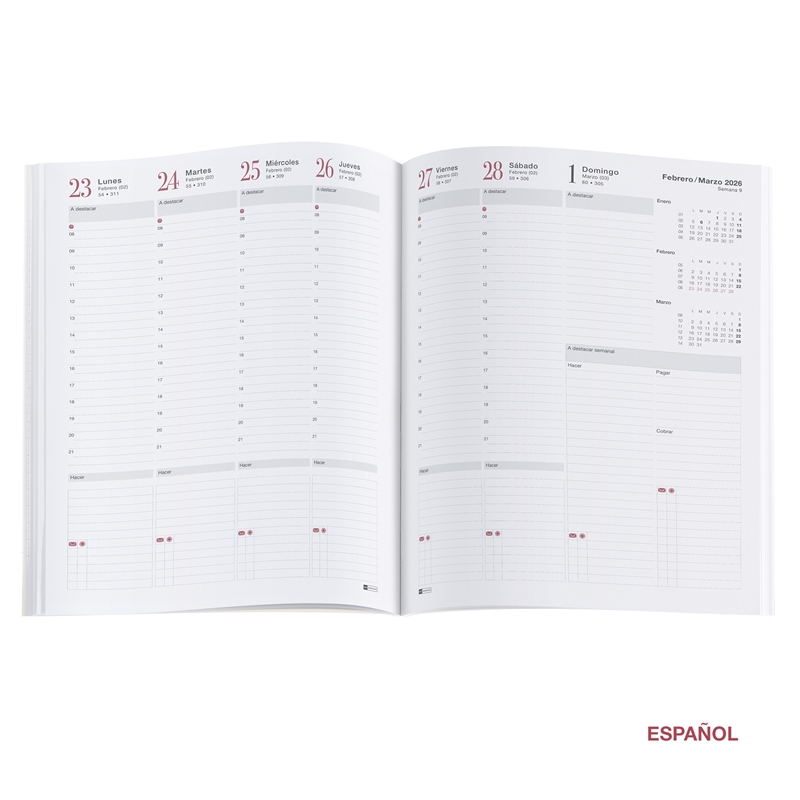 Cubiertas cosidas de símil piel (poliuretano). Papel 80 g/m², FSC Mix Credit. Tamaño: Pro 210 x 270 mm. Anualidad: Semana a la vista vertical (S/VV) de Enero a Diciembre 2026. Idiomas: Castellano Encuadernación cosida con cinta marcador. Contenido: Anualidad semana a la vista vertical, hoja de datos personales, calendario trimestral en cada doble página, calendarios 3 años, recomendaciones, horario semanal, fechas a recordar, planning mensual, onomástica, días festivos, conversiones medidas, temperaturas internacionales, diferencias horarias internacionales, tallas internacionales, distancias kilométricas, 16 páginas de notas, regla, espacio destacados. Iconos que indican: cambio horario, inicio de estaciones, año nuevo chino, carnaval y lluvia de estrellas (entre otros).