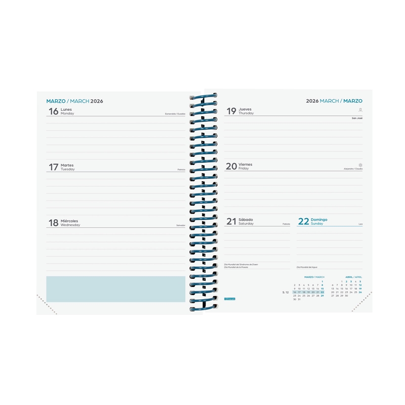 Formato pequeño y práctico, fácil de transportar.Duración: Septiembre 2025 – Junio 2026 (curso lectivo) + Julio y Agosto resumidos. Interior: Semana Vista Horizontal. Con indicación en la anualidad de los festivos de España.La anualidad de la agenda contiene: onomástica, festivos nacionales, cambios de estación, días mundiales e internacionales de interés y días señalados.